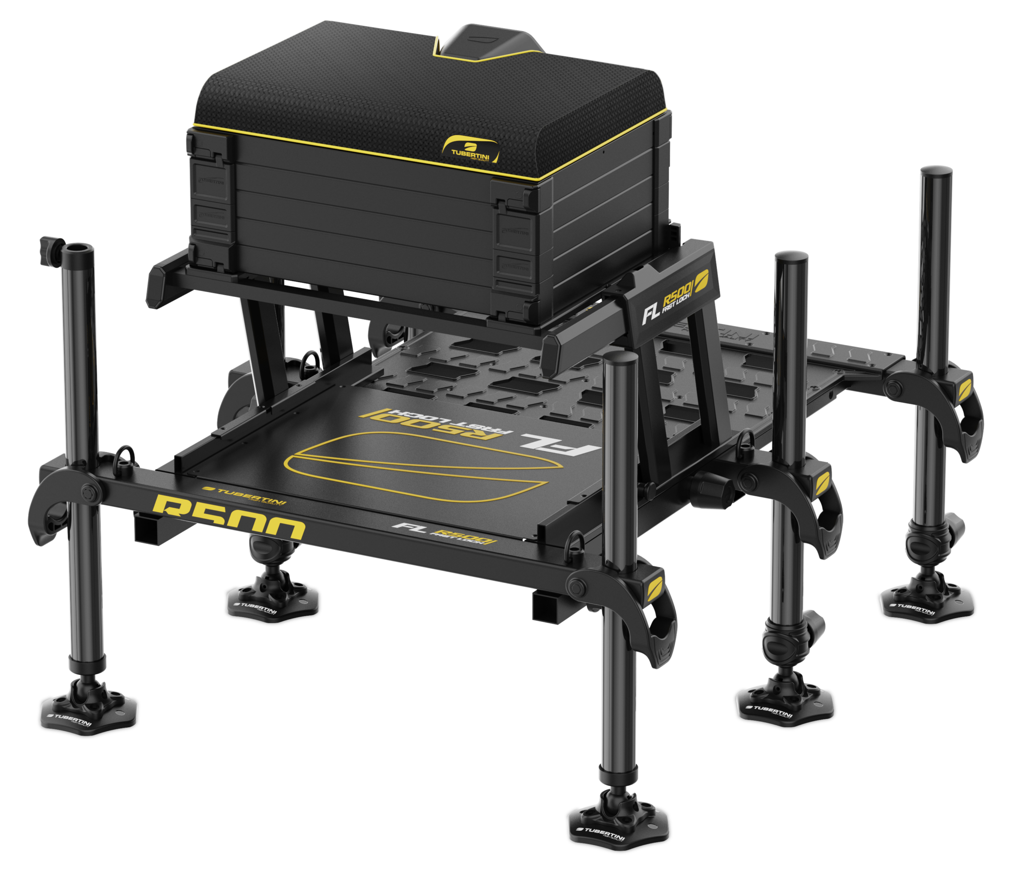 De nieuwe FL R500 is ontworpen voor de meest veeleisende competitievisser die topprestaties eist van zijn materiaal. Het volledig herwerkte frame is opgebouwd uit vernieuwde profielen en gevormde panelen die de geïntegreerde waterpassen mooi opnemen en de zitkist een moderne en professionele uitstraling geven.De poten met een diameter van 36 mm werden geoptimaliseerd om gewicht te besparen zonder in te boeten op stevigheid. Dankzij het nieuwe "Fast Lock"-systeem worden de poten snel, eenvoudig en stevig vergrendeld. Door een rotatie van 90° van de hendel activeert het interne excentermechanisme de klem die de poten vastzet aan het frame. De kracht van deze vergrendeling is bovendien instelbaar via een handige draaiknop.De vernieuwde zitkussen is uitgevoerd met verbeterd memory foam voor maximaal comfort, afgewerkt in een modern, waterdicht materiaal met een eigentijds reliëfontwerp. De geïntegreerde rubberen steun voor de hengel maakt het geheel compleet. Dankzij het nieuwe hendelsysteem is ook de breedte van de zitkist met ongeveer 4 cm verminderd – compacter én praktischer voor onderweg.FL R500: waar innovatie, comfort en prestaties samenkomen aan de waterkant.