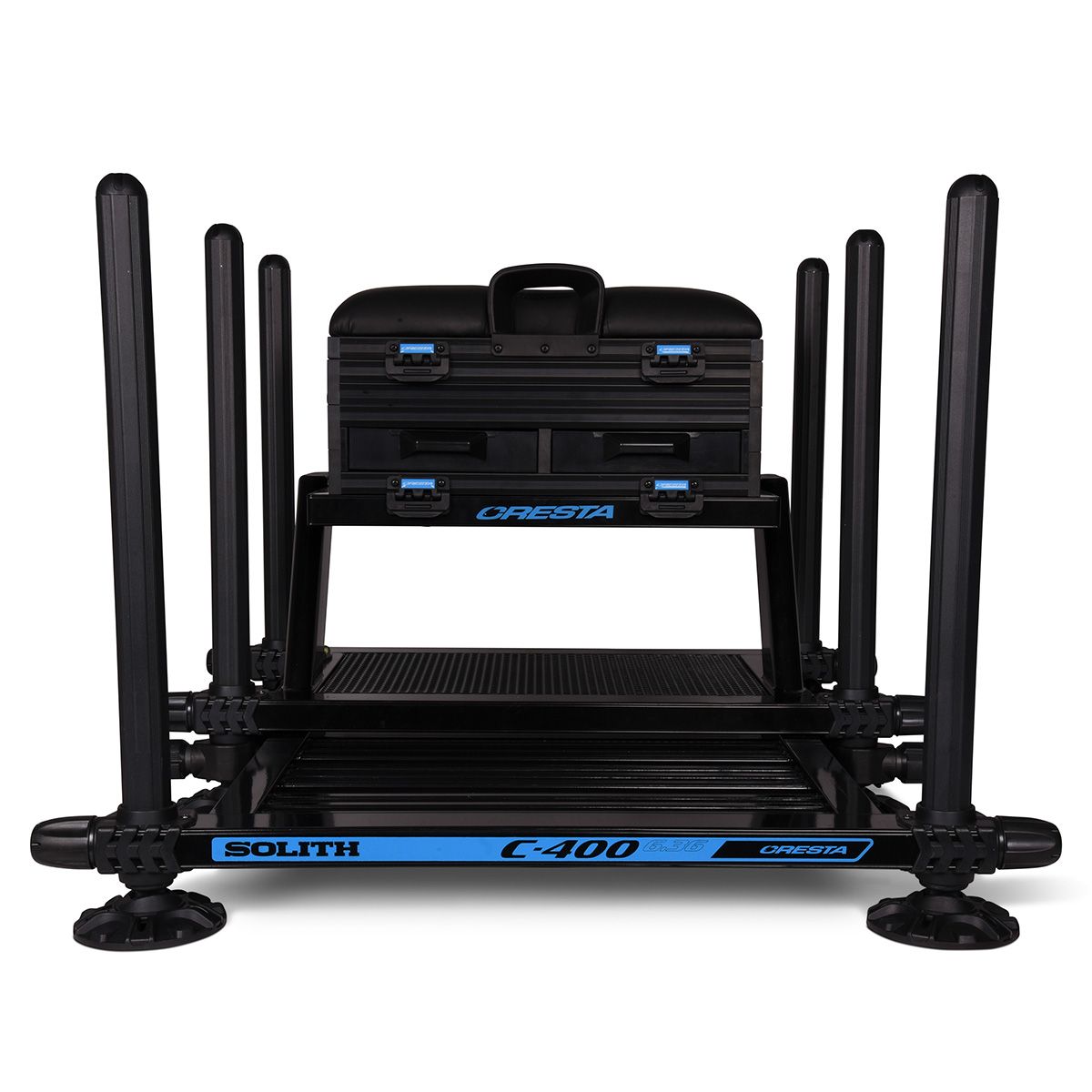 • De Solith C400 zitmand biedt alles wat vaste hengel- en feedervissers nodig hebben voor een comfortabele en functionele viservaring. Het ontwerp zorgt voor de perfecte balans tussen stabiliteit, robuustheid en gewicht, wat resulteert in een lichtgewicht zitmand met 6 stevige poten.Twee kleurenopties: De Solith C400 is verkrijgbaar in twee kleuren: de volledig zwarte versie en een nieuwe variant met een wit gelakt frame.Zitkussen: Het zitkussen is ontworpen met een zachte bovenlaag en een stevigere kern, wat zorgt voor langdurig comfort. De uitsparing met polehook maakt het gemakkelijk om de hengel centraal te ondersteunen.Opbergcompartimenten: Onder de zitting bevindt zich een ruim opbergvak voor tuig en dobbers. Daarnaast beschikt de C400 over een zijlade en twee voorladen met magneetsluiting. Het onderste deel van het frame is afgesloten met een gaasplaat, wat zorgt voor extra geventileerde opslag.Frame en poten: Het aluminium frame is lichtgewicht en voorzien van een traploos verstelbaar voetplateau. Dankzij het ontwerp kan de mand dicht bij de grond worden geplaatst, terwijl de Ø 36 mm poten voor stabiliteit zorgen. Vier van de zes poten zijn telescopisch, met kantelbare modderpoten en een afgeronde bovenkant. Het 360º non-marking systeem houdt de poten stevig op elke hoogte.